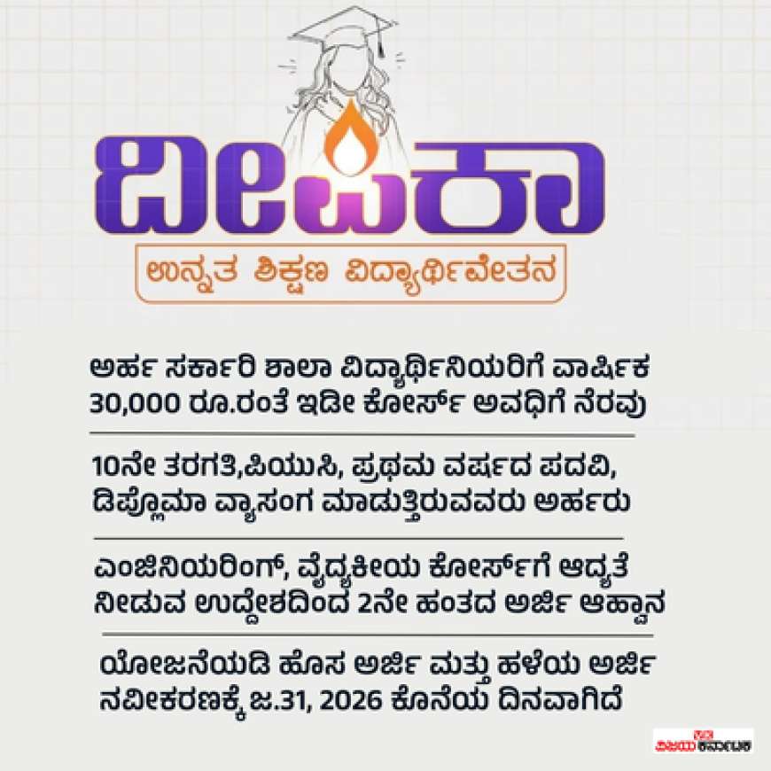 ಕರ್ನಾಟಕ ಸರ್ಕಾರ ಮತ್ತು ಅಜೀಂ ಪ್ರೇಮ್ಜೀ ಫೌಂಡೇಶನ್ ಜಂಟಿಯಾಗಿ 'ದೀಪಿಕಾ ವಿದ್ಯಾರ್ಥಿವೇತನ' ಯೋಜನೆಯನ್ನು ಜಾರಿಗೆ ತಂದಿದೆ. ಸರ್ಕಾರಿ ಶಾಲೆ ಮತ್ತು ಕಾಲೇಜುಗಳಲ್ಲಿ ಪದವಿ ಅಥವಾ ಡಿಪ್ಲೊಮಾ ವ್ಯಾಸಂಗ ಮಾಡುತ್ತಿರುವ ವಿದ್ಯಾರ್ಥಿನಿಯರಿಗೆ ವಾರ್ಷಿಕ 30,000 ರೂ. ಆರ್ಥಿಕ ನೆರವು ನೀಡಲಾಗುತ್ತದೆ. ಎರಡನೇ ಹಂತದ ಅರ್ಜಿ ಸಲ್ಲಿಕೆ ಜನವರಿ 31, 2026 ರವರೆಗೆ ನಡೆಯಲಿದೆ. ಹೆಣ್ಣುಮಕ್ಕಳ ಉನ್ನತ ಶಿಕ್ಷಣಕ್ಕೆ ಈ ಯೋಜನೆ ಬೆಂಬಲ ನೀಡುತ್ತದೆ.