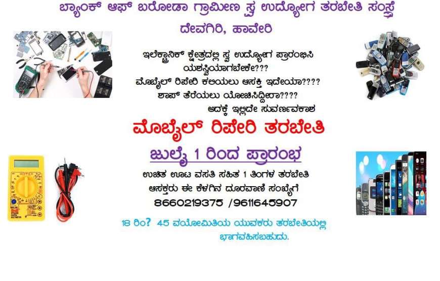 *ಬ್ಯಾಂಕ್ ಆಫ್ ಬರೋಡ ತರಬೇತಿ ಸಂಸ್ಥೆ ದೇವಗಿರಿ ಹಾವೇರಿಯಲ್ಲಿ *" ಮೊಬೈಲ್ ರೀಪೆರ್* "ತರಬೇತಿ ಯನ್ನು *ಜುಲೈ ತಿಂಗಳಲ್ಲಿ* ಹಮ್ಮಿಕೊಳ್ಳಲಾಗಿದೆ
