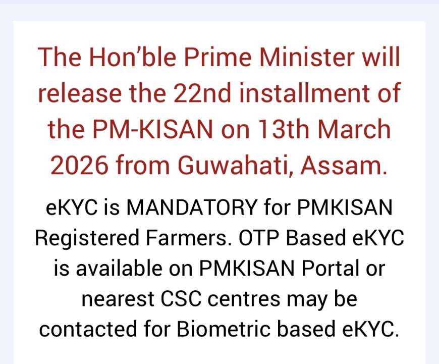ಪಿಎಂ ಕಿಸಾನ್ 22ನೇ ಕಂತನ್ನು ಪ್ರಧಾನಿ ನರೇಂದ್ರ ಮೋದಿಯವರು ಮಾರ್ಚ್ 13ರಂದು ಆಸ್ಸಾಂನ ಗೋಹಾಟಿಯಿಂದ ಬಿಡುಗಡೆ ಮಾಡಲಿದ್ದಾರೆ.