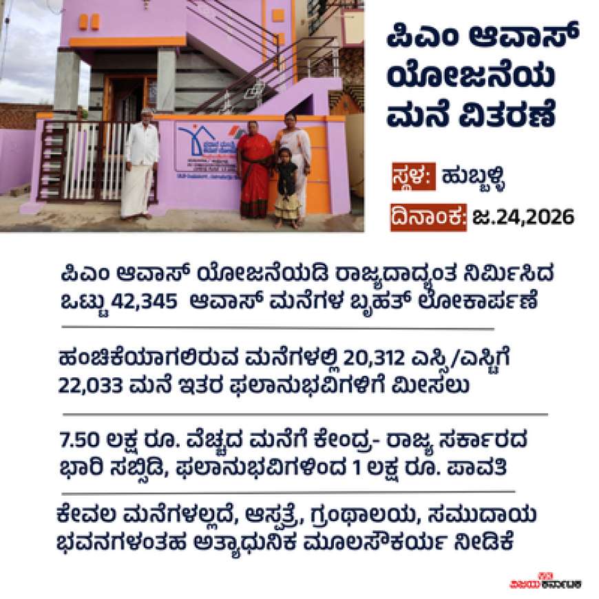 - ಪ್ರಧಾನ ಮಂತ್ರಿ ಆವಾಸ್ ಯೋಜನೆಯಡಿ ನಿರ್ಮಿಸಲಾದ ಮನೆಗಳ ವಿತರಣಾ ಸಮಾರಂಭವು 2026ರ ಜನೆವರಿ 24ರಂದು ಬೆಳಿಗ್ಗೆ 11:00 ಗಂಟೆಗೆ ಹುಬ್ಬಳ್ಳಿಯ ಮಂಟೂರು ರಸ್ತೆಯಲ್ಲಿ ಜರುಗಲಿದೆ.