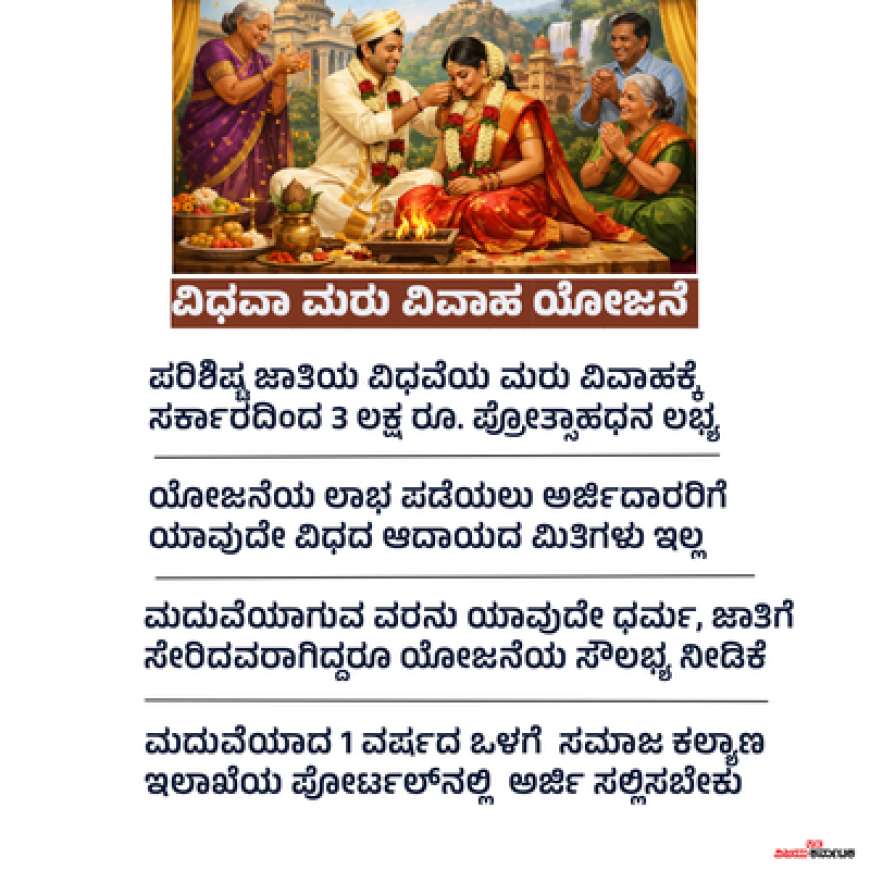 ಕರ್ನಾಟಕ ಸರ್ಕಾರ ಪರಿಶಿಷ್ಟ ಜಾತಿಯ ವಿಧವೆಯರ ಪುನರ್ವಿವಾಹಕ್ಕೆ 3 ಲಕ್ಷ ರೂಪಾಯಿ ಪ್ರೋತ್ಸಾಹಧನ ನೀಡುತ್ತಿದೆ. ಈ ಯೋಜನೆಯು ಮಹಿಳೆಯರಿಗೆ ಸಾಮಾಜಿಕ ಮತ್ತು ಆರ್ಥಿಕ ಭದ್ರತೆ ಒದಗಿಸುವ ಗುರಿ ಹೊಂದಿದೆ. ಮದುವೆಯಾದ ಒಂದು ವರ್ಷದೊಳಗೆ ಅರ್ಜಿ ಸಲ್ಲಿಸಬೇಕು. ಯಾವುದೇ ಆದಾಯ ಮಿತಿ ಇಲ್ಲ. ಅರ್ಹತೆ ಮತ್ತು ಅಗತ್ಯ ದಾಖಲೆಗಳ ವಿವರಗಳನ್ನು ನೀಡಲಾಗಿದೆ. ಹೆಚ್ಚಿನ ಮಾಹಿತಿಗೆ ಸಹಾಯವಾಣಿ ಲಭ್ಯವಿದೆ.